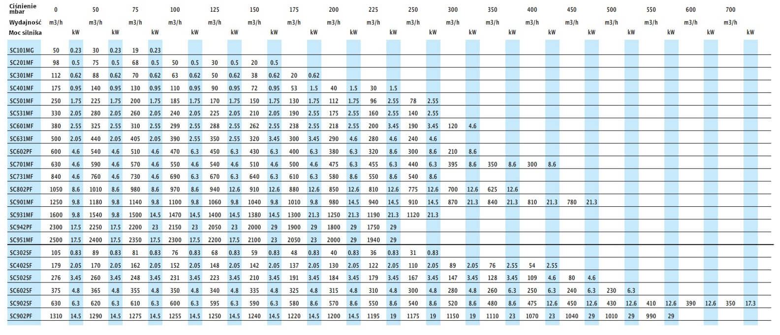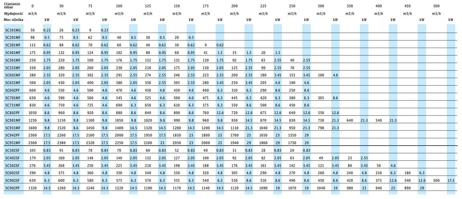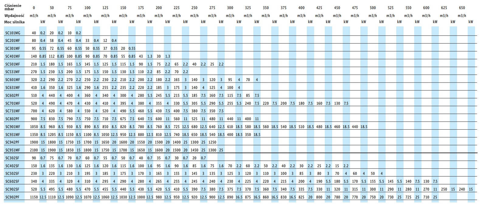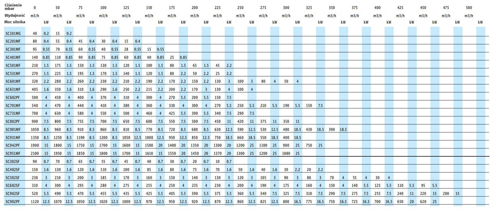 Tabela zbiorcza dmuchaw bocznokanałowych