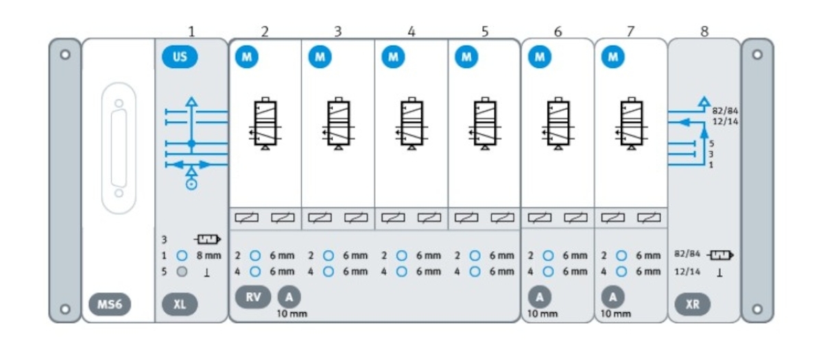 - Wyspa VTUX, Multipin, 6x 5/2 VTUX-A-P-MS6-SD-US6M-XLRV6AXR