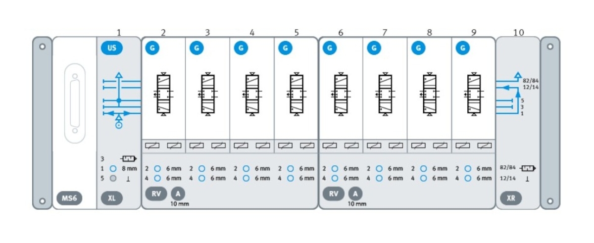 - Wyspa VTUX, Multipin, 8x 5/3 centralnie odcięty VTUX-A-P-MS6-SD-US8G-XLRV4ARV4AXR