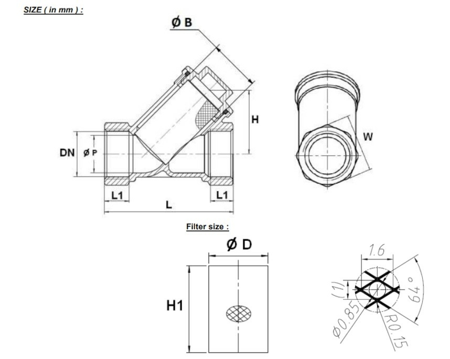 - Filtr siatkowy mosiężny, PZH do wody pitnej, oczko 0,85 mm