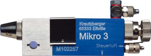 | Charakterystyka | Pistolet automatyczny Mikro 3 jest wyjątkowo mały i dlatego nadaje się do stosowania w bardzo ograniczonych przestrzeniach, takich jak systemy natryskowe (gdzie modele Mikro 3 mogą być instalowane obok siebie). Pistolet natryskowy Mikro 3 jest sterowany pneumatycznie i jest wyposażony w wewnętrzny regulator powietrza wstępnego. Układ sterowania jest uruchamiany przez mechaniczny lub elektromechaniczny zawór trójdrogowy. Po włączeniu tłok sterujący napędzany sprężonym powietrzem otwiera najpierw zawór powietrza rozpylającego, a następnie dyszę materiałową pistoletu. Podczas wyłączania wpierw dysza materiału zostaje zamknięta, a następnie zawór powietrza rozpylającego. Ta procedura kontrolna zapewnia szybszą pracę i zapobiega kapaniu z dyszy materiału. Główny element, w tym części głowicy z płynem, jest niklowany chemicznie. Dysze i igły materiału są standardowo wykonane ze stali nierdzewnej. |