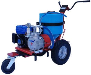 | Charakterystyka | Autonomiczny agregat natryskowy zalecany do oprysków zewnętrznych. Pompy można używać z dwoma wężami podłączonymi do wylotu pompy Jednostka zamontowana na łatwym w manewrowaniu wózku ma moc 5,5 KM. Silnik benzynowy Yamaha połączony z pasem transmisyjnym do wysokociśnieniowej pompy membranowej. Dostępne dwie opcje: ze zbiornikiem PVC o pojemności 50 l lub wężem ssącym do użytku z pojemnikiem 30 L zamontowanym na wózku. |