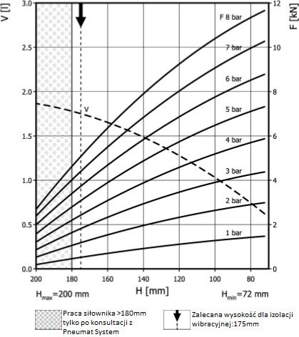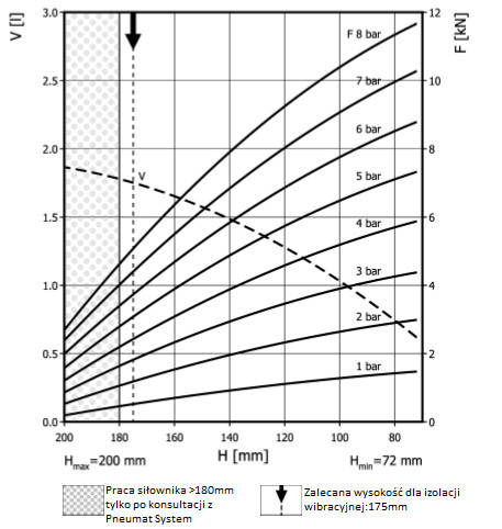 - Dmax. 165 mmPrzestrzeń potrzebna do instalacji [C]180 mmH max180 mmH min72 mmSiła uzyskana na H max przy 6 barach3,2 kN