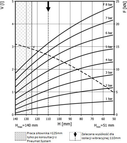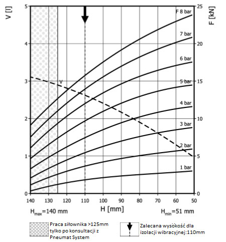 - Dmax. 250 mmPrzestrzeń potrzebna do instalacji [C]265 mmH max125 mmH min51 mmSiła uzyskana na H max przy 6 barach9 kN