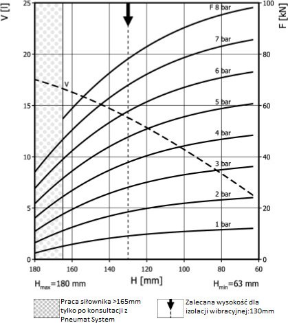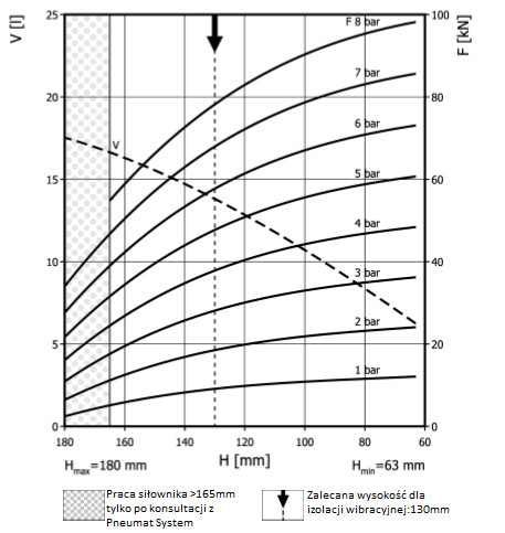 - Dmax. 450 mmPrzestrzeń potrzebna do instalacji [C]480 mmH max165 mmH min63 mmSiła uzyskana na H max przy 6 barach40 kN