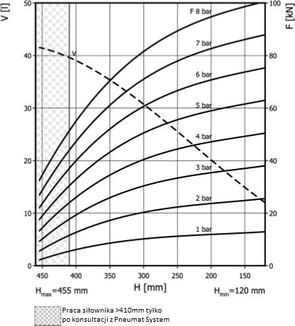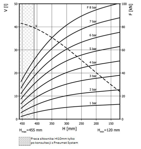- Dmax. 462 mmPrzestrzeń potrzebna do instalacji [C]510 mmH max410 mmH min120 mmSiła uzyskana na H max przy 6 barach36 kN