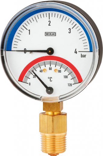 | Element pomiarowy | Ciśnienie: Rurka Bourdona, stop miedzi ; Temperatura: Spirala bimetalowa, stop miedzi |