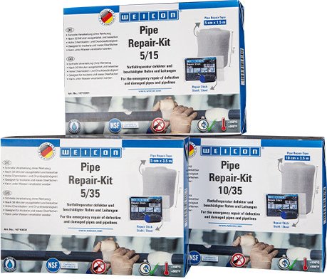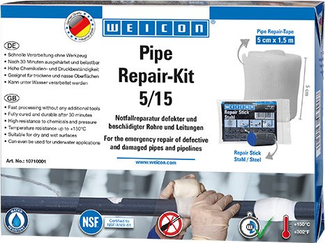 | Charakterystyka | Zestaw WEICON Pipe Repair-Kit zawiera: Repair Stick Steel, instrukcję montażu, rękawice ochronne i specjalną taśmę wzmocnioną włóknem szklanym |