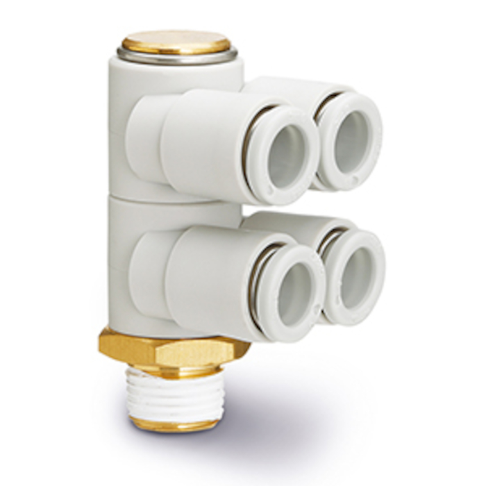 Złączka wtykowa kątowa 4-krotna do węża fi 6 gwint 1/8 mosiądz uszczelnienie SMC