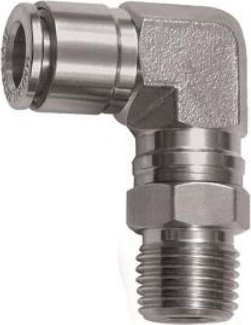 Złączka wtykowa kątowa obrotowa, gwint zewnętrzny stożkowy R, ciśnienie 20 bar, stal nierdzewna 316 L